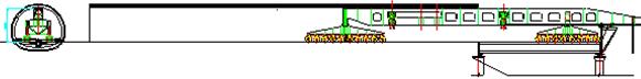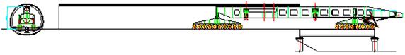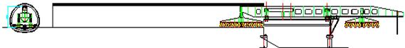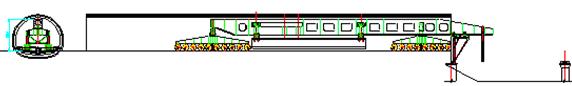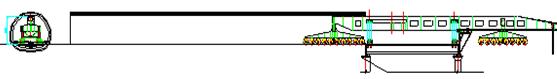 3、操作系統由運輸狀態轉換至喂梁狀態,由后車及主支腿驅動裝置推動整機前行,當輔助支腿到達待架孔前方橋墩支承位置時停車。在箱梁下面放置臨時支墩,并將箱梁放在臨時支墩上,然后打好輔助支腿。