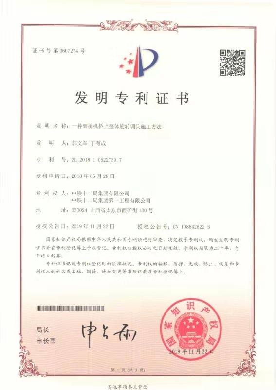 【發(fā)明專利證書】一種架橋機(jī)橋上整體旋轉(zhuǎn)調(diào)頭施工方法